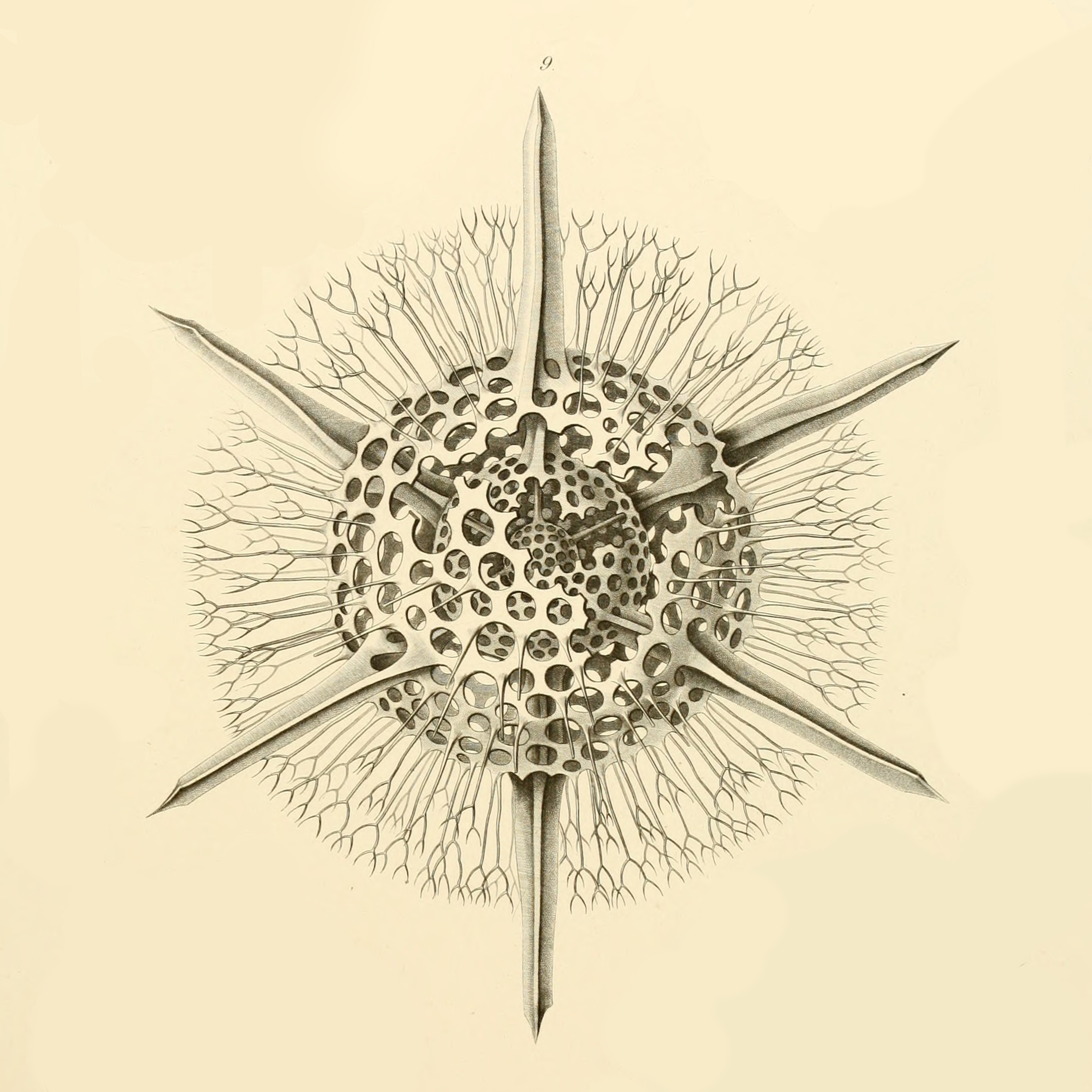 Radiolaria are microscopic single-celled organisms that live freely floating in our oceans. Most famously Ernst Haeckel discovered hundreds of new types and documented them in detailed illustrations. The name "radiolaria" derives from the cell’s outer structure of star-like antennae. These needles are like rays through which they absorb smallest organisms for nutrition. One may see these invisible beings as the electrons of our world’s oceans. Ernst Haeckel published "Kunstformen aus dem Meer: Radiolarien" in 1862. 1888 Heinrich Hertz, thanks to many scientists before him, succeeds in transmitting electromagnetic waves over a distance of ten meters.
